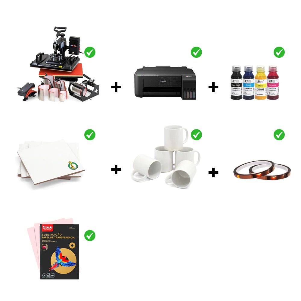 O Kit 1° Passo para Sublimação é o combo completo para iniciar o seu negócio com qualidade e segurança. Ele inclui todos os equipamentos e insumos necessários para começar a personalizar com resultado profissional.